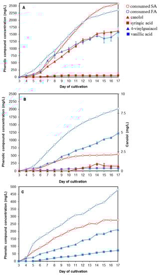 SA and FA metabolism by N. lepideus BRFM 15 (A), S. commune BRFM823 (B) and S. hirsutum BRFM889 (C): consumption of SA or FA in relation to the production of canolol and syringic acid, and VG and vanillic acid, respectively.
