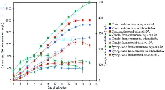 In a second step, the natural SA ethanolic solution was subsequently added to 3-day-old cultures of N. lepideus BRFM15 and then fed daily to maintain a final concentration of 300–400 mg/L in the culture medium. The results were compared to the equivalent bioconversion process performed with commercial SA added as either an ethanolic or an aqueous solution (Figure 5). The production of canolol from natural SA started on day 4 of cultivation to reach the maximum concentration of 1.277 g/L on day 13 with a productivity of 100 mg/L day and a molar yield of 80%. It is noteworthy that the supply of either natural or commercial SA as an ethanolic solution made it possible the decrease of syringic acid synthesis by a factor of 1.6–2, during the first 9 days of cultivation, compared with commercial SA dissolved in water.