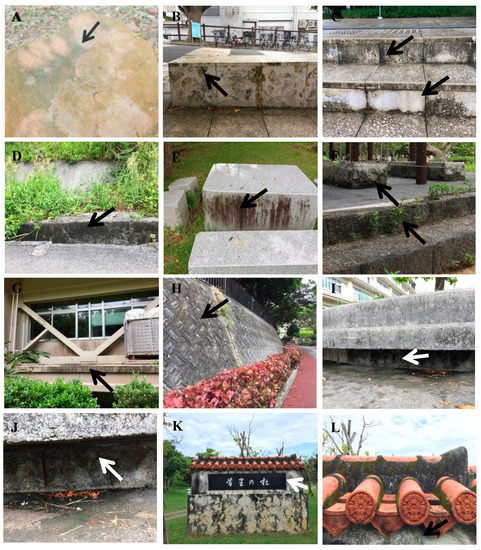 Pictures of blackened sampling points (arrows). (A) tree stump, Ru1; (B) limestone bench, Ru3; (C) limestone stairs, Ru4 and Ru5; (D) side wall of ditch, Ryu1; (E) side wall of a stone desk, Ryu2; (F) side wall of stone foundations, Ryu3 and Ryu4; (G) wall of a school building, Ryu5; (H) road side wall, Ryu7; (I,J) bottom part of a concrete bench, Ryu8; (K) side of a university monument, Ryu9.1; (L) shaded part of the roof of the monument, Ryu9.2.