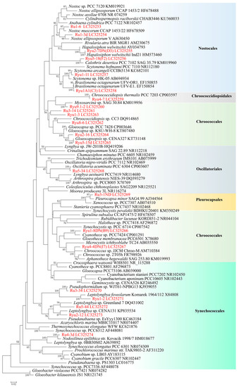 Twenty-two strains (=sequences) approximately 1100 bp in length were selected and utilized in phylogenetic analyses for diversity evaluation of terrestrial cyanobacterial strains. Seventy-one 16S rRNA sequences were obtained from NCBI GenBank from the data of Komárek et al. [42] and from BLAST similarity searches, and were used to construct the phylogenetic tree. We constructed a maximum likelihood (ML) phylogenetic tree with a total of 105 sequences. Bootstrap values were tested 1000 times using the rapid bootstrap option (Figure 4). The resulting phylogenetic tree was divided into six main clades corresponding to Nostocales, Chroococcidiopsidales, Chroococcales, Oscillatoriales, Pleurocapsales, and Synechococcales. Some strains were closely related with GenBank data; e.g., Ryu2-7DN(D3) was closely related with Hapalosiphon welwitschii AY034793, Ryu4-7 was closely related with Chroococcidiopsis thermalis PCC7203 (CP003597), and Ryu5-15d was closely related with Gloeocapsopsis sp. CENA327 (KT731148). Also, many strains were identifiable to the generic levels, some within the same genus; e.g., Ru1-6 and Ru1-3d belonged to the genus Nostoc, Ryu1A1(C3) belonged to Brasilonema, Ryu1-11 belonged to Scytonema, and Ru4-3d belonged to Nodosilinea. On the other hand, other strains had no close relatives in GenBank, such as strains Ru3-14, Ryu8-6, and Ryu1-3.