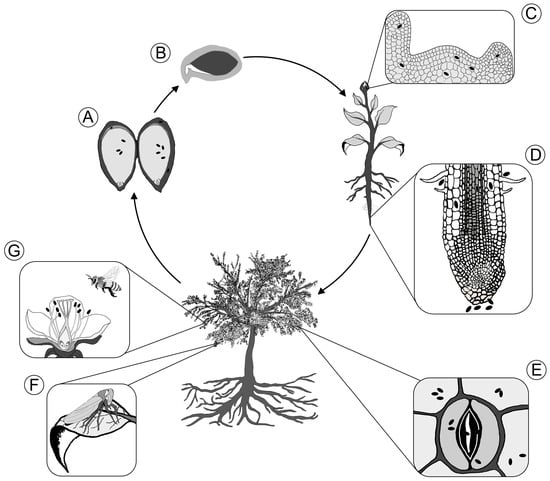 Here, we review known and potential routes of transmission for bacterial endophytes. The review is organized by transmission route (vertical vs. horizontal), rather than plant organ or order of importance. We begin by reviewing vertical transmission from the parent plant via seed or pollen, then move to horizontal transmission from the environment, starting with the germination environment and ending with the floral organs. Figure 1 summarizes the different transmission routes and modes reviewed. Vertical transmission of bacterial via seed and pollen likely occurs, as bacteria have been identified inside the seed of many different plant species (Figure 1A). Endophytes that are consistently transferred across generations must have a route from seeds to reproductive organs, either via xylem vessels or via the shoot apical meristem that differentiates into reproductive organs (Figure 1C). Soil is considered the dominant environment from which bacterial endophytes originate [36], and soil-to-root is the best-studied horizontal transmission route. Soil bacteria can colonize the plant interior and become endophytes early, via the germination environment called the spermosphere (depicted in grey in Figure 1B), or later through the rhizosphere and into the root of seedlings and adults (Figure 1D). The above-ground plant surface, or phyllosphere, is colonized with a diverse community of microorganisms, presenting an alternative, but less-studied, route of entry for bacteria that originate from rainwater, bioaerosols from surrounding soil, or from dust and other particles in the atmosphere, and potentially gain entry via stomata (Figure 1E). It is probable that stomata serve as a transmission route for plants of all life stages, but may be especially important for foliar endophytes of trees. In addition, sap-feeders and pollinators, and other arthropods may serve as vectors for bacteria that colonize the inside of plants (Figure 1F,G). Mixed transmission modes are probably not uncommon since, for example, bacteria applied to flowers can be transferred to the next generation [37]. However, the relative importance of different transmission routes is not known for most plants. To complicate matters more, many endo- and epiphytic bacteria can colonize plants above and below, inside and out [38,39], highlighting the importance of bacterial movement within the plant for the transmission of bacteria between plants. Bacteria have been shown to colonize the xylem vessels [40], which are thought to represent the main transport route for systemic colonization of interior plant tissues, though the process can take several weeks [26].