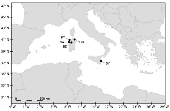 Location of the study area and sampling sites. (Lake Bidighinzu = BD; Gulf of Olbia = GO; Porto Torres harbour = PT; Gulf of Alghero = GA; Syracuse bay = SY).