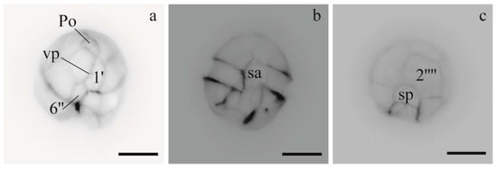 Light micrographs of Alexandrium minutum cells (UNISS3 and UNISS4 strains), stained with Calcofluor and observed using UV fluorescence. (a,b) apical and ventral views showing the ventral pore (vp) in the 1′ plate and the wide anterior sulcal plate (sa); (c) antapical view showing the 2′′′′ plate. Scale bars 10 μm.