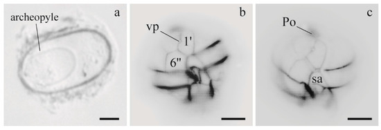 Light micrographs of Alexandrium tamarense cyst and cells (UNISS5 strain), stained with Calcofluor and observed using UV fluorescence. (a) empty cyst showing the shape of archeopyle; (b,c) ventral views showing the ventral pore (vp) in the 1′ plate, the wide 6′′ plate and the connection between the 1′ plate and apical pore plate (Po). Scale bars 10 μm.