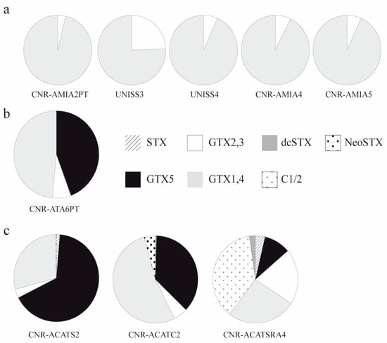 Percentage composition of PST toxins in the analysed strains. a = Alexandrium minutum strains; b = A. tamarense strain; c = A. pacificum strains.