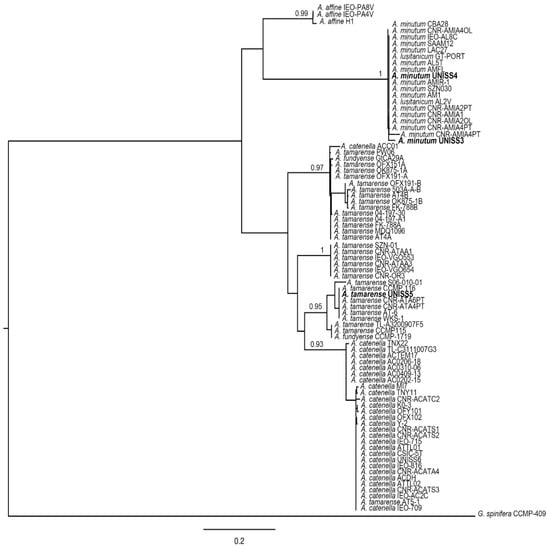Data on the genetic analyses of A. pacificum CNR–ACATS2, CNR–ACATC2, CNR–ACATSRA4, A. tamarense CNR–ATA6PT, A. minutum CNR–AMIA2PT, CNR–AMID6, CNR–AMISY1, CNR–AMIA4 and CNR–AMIA5 have already been reported [,,,]. All sequences used in the trees are listed in Supplementary Materials (Tables S1 and S2).