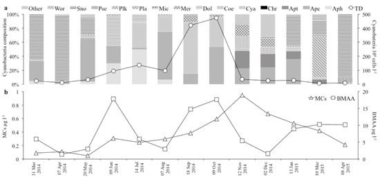 Temporal dynamics of (a) cyanobacteria composition at the genus level (left axis) and cell density (right axis) and of (b) microcystins (left axis) and BMAA (right axis) concentrations. (TD = cyanobacterial total cell density; Aph = Aphanizomenon; Apc = Aphanocapsa; Apt = Aphanothece; Chr = Chroococcus; Cya = Cyanocatena; Coe = Coelosphaerium; Dol = Dolichospermum; Mer = Merismopedia; Mic = Microcystis; Pla = Planktolyngbya; Plk = Planktothrix; Pse = Pseudanabaena; Sno = Snowella; Wor = Woronichinia; Other = unidentified cyanobacteria; BMAA = β-N-methylamino-l-alanine; MCs = microcystins).