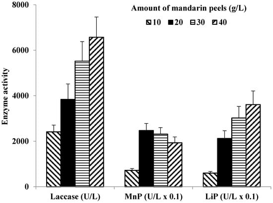 To determine optimal concentration of mandarin peels for LiP production, four concentrations were tested in growth medium. With a gradual increase of the mandarin peels content (from 10 to 40 g/L), the level of C. gallica LiP activity increased up to 6-fold, from 600 to 3610 U/L (Figure 1). Similarly, the laccase activity increased and almost tripled from 2410 U/L when 10 g/L of mandarin peels concentration was used to 6570 U/L when 40 g/L of mandarin peels was added into the growth medium. C. gallica 142 MnP activity showed an increase from 720 U/mL to 2470 U/L when mandarin peel concentration was changed from 10 to 20 g/L. However, further increase in concentration of growth substrate caused a statistically insignificant decrease in MnP activity.