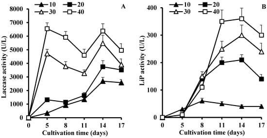 Profiles of laccase (A) and LiP (B) activities of C. gallica 142 in cultivation media supplemented with varied concentration of mandarin peels (g/L).