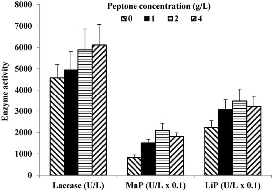 To facilitate optimum growth conditions for C. gallica 142 culture, peptone concentrations were investigated in relation to the LME production. The experiment results show that laccase production increased from 4570 U/L to 6110 U/L when peptone concentrations increased from 0 to 4 g/L (Figure 3), suggesting a direct correlation with higher biomass production. However, when MnP activity was analyzed, a 3-fold increase in the enzyme activity at peptone concentration of 2 g/L was observed in comparison with the control medium, suggesting possible peptone-based induction. Additional increase in nitrogen concentration (>2 g/L) showed inhibition in MnP secretion. Similar correlation was observed for LiP production: when peptone concentration increased from 0 to 2 g/L, the maximum enzyme activity changed from 220 to 350 U/L. In the subsequent experiments, 2 g/L concentration of peptone was used as a nitrogen source.
