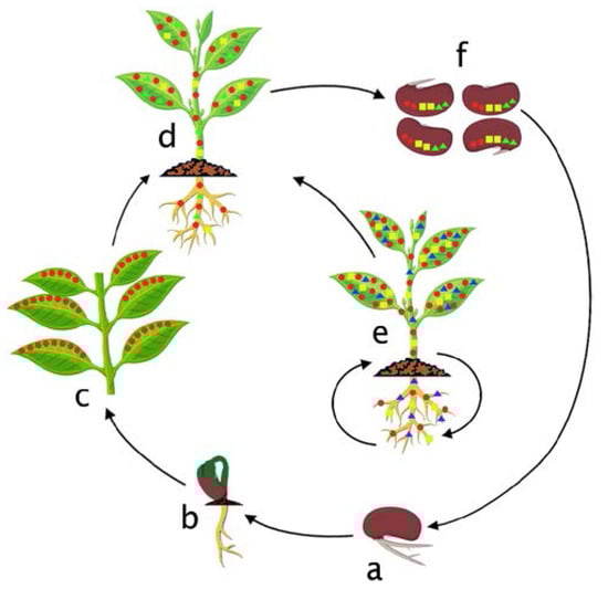 Hypothesized colonization cycle of bacterial endophytes in the host plant. (a) Mobilization of seed endophytes in germinating seedlings. (b) Recruitment of alien endophytes from the soil in developing seedlings. (c) Colonization by alien and inherited endophytes. (d) Whole plant colonization by various endophytes. (e) Variation of endophyte communities in the host plant in response to different biotic and abiotic stresses. (f) Vertical transfer of endophytes into seeds.