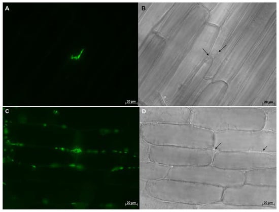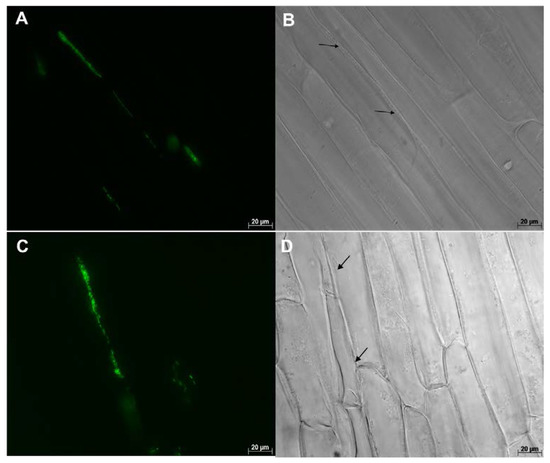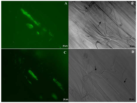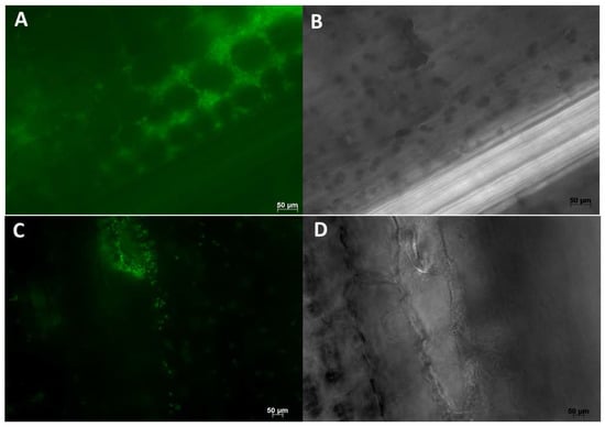 Maize (hybrid 29B17) roots colonized by WP5gfp visualized under 630× magnification. Image on the left (A,C) were taken with the GFP filter, and images on the right (B,D) were taken without the GFP filter. Groups of WP5gfp cells were observed in the intercellular spaces of cell layers in the longitudinal direction.