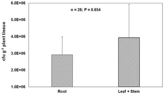 WP5gfp was recovered from surface sterilized maize root, leaf and stem samples. Higher WP5gfp CFU was observed in leaves and stems in contrast to root samples (Figure 6). Average WP5gfp CFU counts were 2.9 × 107 per gram of roots, and 3.9 × 107 per gram of leaves and stems. No colonies were observed in the mock-inoculated control plants. In another study, significantly higher numbers of CFUs were also observed in shoots than roots [12]. The bigger areas of leaves and stems may allow higher numbers of endophytes to colonize compared to the roots.