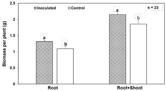 Root, and root and shoot biomass of WP5gfp inoculated and mock-inoculated control plants in maize hybrid 29B17. Error bars represent standard error of the mean. Histograms with different letters are statistically different at p < 0.05.