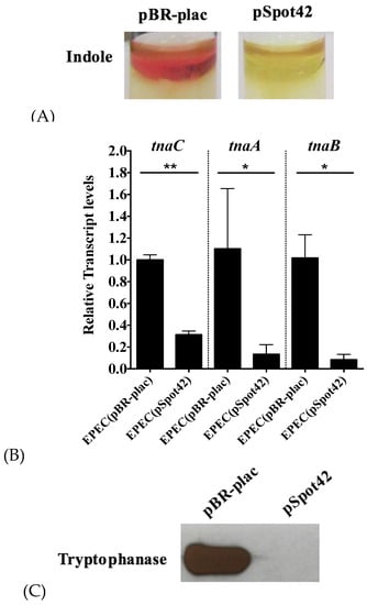 3.1. Overproduction of Spot42 Inhibits Indole Biosynthesis by Down-Regulating the tnaCAB mRNA