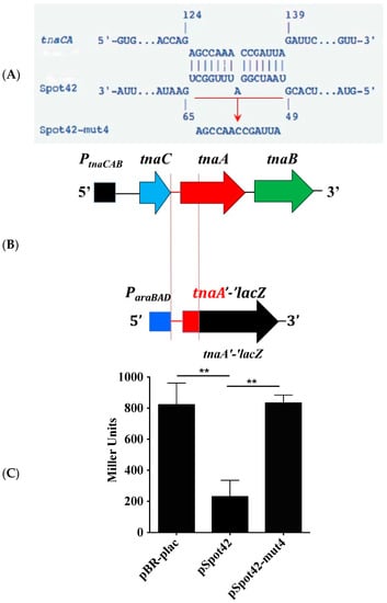 3.2. The tnaC-tnaA Intergenic Region Is Sufficient for Spot42-Dependent Repression