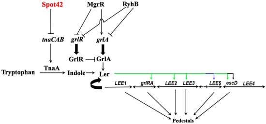 In summary, we have demonstrated that the Hfq-dependent sRNA Spot42 base-pairs to the tnaCAB mRNA to globally silence gene expression from the entire transcript presumably by destabilizing it. The reduction in mRNA levels, in turn, leads to reduced expression and steady-state levels of the structural and regulatory proteins involved in indole biosynthesis (Figure 4). In the absence of indole, the LEE1 promoter is not optimally active and Ler transcription is reduced (Figure 4), which, in turn, is expected to delay and diminish the morphogenesis of A/E lesion.