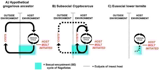 One explanation offered for the death of termite flagellates during host molt was that because termites exhibit colony-wide proctodeal trophallaxis, the SE cycle in their flagellates was superfluous and expendable, as the flagellates were never exposed to the outside environment [16]; this explanation is still popular [72,73]. It is the premise of this paper that the directionality of cause-and-effect of this common assumption should be reversed. Instead of colony-wide trophallaxis leading to the death of flagellates at host molt, the early stages of eusociality led to dysfunctional SE cycles in the flagellates and required a behavioral solution on the part of the host: colony-wide trophallaxis [18,51].