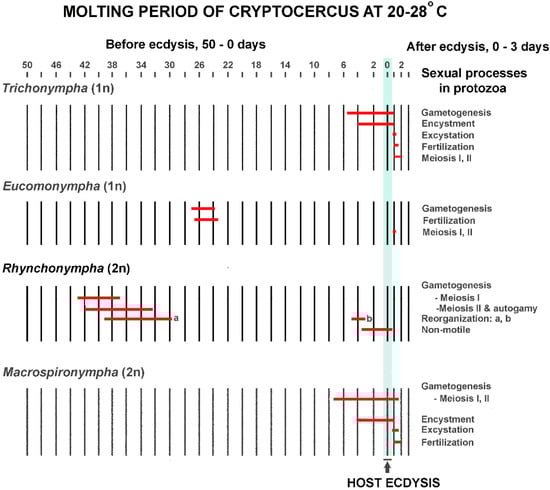 In Cryptocercus, the timing of host hormonal ebb and flow for the flagellate SE cycle is critical to the outcome, just as it is for termite caste determination. From the beginning of the molting period until several hours after ecdysis, the host is constantly changing the hormonal environment in which the hindgut protists live [81]. Each flagellate species has its own time schedule in the host molting process for initiating its SE cycle; this reflects the different thresholds of susceptibility to host ecdysone levels. For example, under natural conditions Barbulonympha, Saccinobaculus and Oxymonas begin gametogenesis 40–45 days before ecdysis of their host, while Trichonympha begins this phase of its life cycle 5–6 days before ecdysis [127]. Timing is so precise that the stage of the sexual cycle in well-studied flagellates can be used as an indicator of the host molting cycle [81]; it is rare for a given stage of the cycle in one flagellate genus to overlap in time with that of another [82]. Although the timing and details of the flagellate cycles differ (Figure 3) [83,84], the common thread is that in each studied flagellate they can be initiated with an injection of ecdysone. This occurs if an adult Cryptocercus or an intermolt nymph is injected in doses too low to trigger ecdysis in the host [84]. The protists do not have intrinsic factors that initiate the SE cycle [81], and molting cycles of the host and SE cycles in the protistans never occur separately [61].