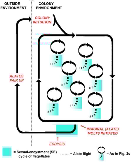 An alternative to the protist as victim hypothesis is that the life cycles of the termite colony and the flagellates became aligned when the host evolved eusociality. Instead of individual host-symbiont fitness, colony-symbiont fitness became coupled, with intermolt termites serving as flagellate reservoirs [51]. An intriguing possibility, then, is that the symbiotic flagellates alternate between sexual and asexual cycles in concert with the colony cycles of their superorganism host (Figure 4). In this model, both the termites and the flagellates are functionally asexual while within the colony, but sexual (in whatever form it takes) when they venture together into the outside environment. Two components of the holobiont became synchronized: the sexual cycles of the gut flagellates, and those of the termite colony, as alates are essentially the gametes of the superorganism. Rather than signaling that the termite flagellates are a victim of the hosts, then, the truncated SE cycles of flagellates in workers in a termite colony exist because the cycles are still functional and of value in termite alates. The crucial time for sexual processes occurs not at individual molt (Figure 2c), but with the founding of new colonies (Figure 4). This accords with the idea that symbiotic associations in social insects are best understood by considering the colony as the host, as the symbionts meet the needs of the colony and not necessarily the individuals that house them [156]. Why would flagellates have retained the mechanism for such an energetically costly process for eons were it merely a dead end?