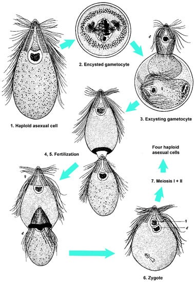 - Wenrich, D.H. Sex in protozoa: A comparative review, In Sex in Microorganisms: A Symposium; Wenrich, D.H., Ed.; American Association for the Advancement of Science: Philadelphia, PA, USA, 1954; pp. 134–265. [Google Scholar]