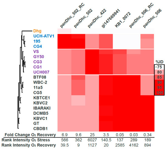 Heatmap coloring the percent identity of the microarray probes targeting the DET1545 RDase homologs aligned to full length sequences of DET1545 homologs encoded on full genomes available for DMC. The DET1545 homologs are ordered according to a CLUSTAL OMEGA alignment of the full length sequences with default parameters, and the phylogenetic tree is presented. The text color represents the groupings within DMC: Cornell (blue), Victoria (purple), Pinellas (black), and a Dehalogenimonas outgroup (orange). The fold change following recovery from the oxygen stress and the rank of the microarray probe intensity at the onset and after the recovery from the oxygen stress is presented in the table below the heatmap.