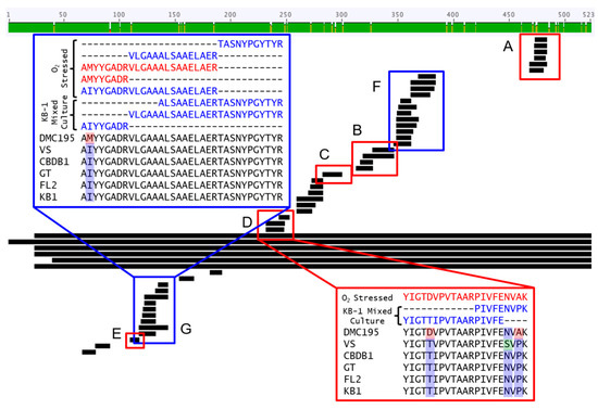 A comparison of RDase DET1545-homolog peptides (short black bars) detected in the KB-1 culture sample and oxygen stressed KB-1 culture to the full length 1545-homolog sequences in DMC genomes in different groups: 1545-Cornell (DMC195), 1545-Victoria (DMC strain VS), and 1545-Pinellas (DMC strains CBDB1, GT, FL2, and the KB-1 mixed culture). Peptides boxed in red (A–E) show strain specificity, whereas peptides boxed in blue (F,G) are highly conserved and align across all strains. In the insets, amino acid residues where variation occurs are highlighted in red if specific for DMC195, green if specific for VS, or blue if not strain-specific. This figure was created using Geneious version 5.0.4 created by Biomatters.