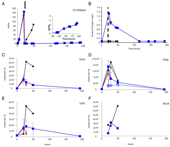 Timecourses of metabolite (A), oxygen (B), and mRNA (C–F) concentrations for specific targets in oxygen stress experiments. The arrow in A (vertical dashed line in B) indicates when the stress was added at 20 h. The controls are in black diamonds, and the stressed bottles are in red triangles (sacrificed ~12 h after stress) and blue squares (sacrificed at end of the experiment). Note that VC + ethene production is recovering at ~100 h after the oxygen stress (inset in panel A). Error bars represent standard error of duplicate reactors. For hupL in panel D, results from degenerate primer sets (dashed lines) are plotted on the same set of axes. Full dechlorination profiles are shown in Figure S3.