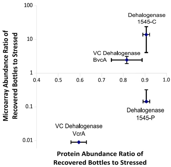 Similarities were observed between the microarray results and multiplex protein results for the oxygen stress experiment. The proteomes of recovering cultures (170 h) were compared to those from 8 h post-stress. In both the microarray and protein datasets, the biomarker abundance ratio of the recovering:stressed cultures was high for BvcA and 1545-C/V probes of the DET1545 homolog and low for VcrA and the 1545-P specific probes (Figure 1 and Figure 5). These RDases were the only DMC RDases detected in both the proteome and transcriptome of the oxygen stressed bottles. Additionally, Geobacter’s PceA enzyme was detected in the proteome, but no probe for its mRNA was contained on the microarray. The stressed cultures were sacrificed only 8 h after the stress was added, which was likely not enough time for protein turnover to lower protein levels in samples. Protein decay rates were previously calculated for DMC RDases in the D2 culture, and were found to be approximately 0.0025 per hour—similar to DNA decay rates [22]. Thus, the cultures sacrificed at 8 h can be thought of as representative of the maximum protein levels observed. In the cultures sacrificed 170 h after the stressor was added, VcrA levels decreased dramatically, whereas the DET1545 homologs and BvcA were at similar levels to the cultures sacrificed at 8 h. As the DMC strains were inactive for a significant portion of this time prior to oxygen depletion, one would expect a decrease in enzyme levels because of decay. That is not the case for the peptides from DET1545 homologs and BvcA in the cultures at the end of the experiment, which are at similar levels to their maximum for this experiment. Thus, DMC strains with 1545-C/V and BvcA homologs appear to recover faster than the strain containing the VcrA and 1545-P type homolog. Diverse DMC strains are a commonly observed feature of organohalide respiring communities [53] and likely contribute to the robustness of the cultures as bioaugmentation agents.