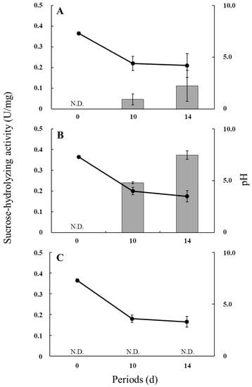 Sucrose-hydrolyzing activities and pH values of media during the incubation of R. microsporus NBRC 32995 (A); R. delemar NBRC 4754 (B); and R. oryzae NBRC 4785 (C). Cell-free extracts were prepared, and the sucrose-hydrolyzing activities (bars: U/mg protein) were measured. Values are the means of three replicates. N.D.: not detected.