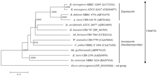 A dendrogram was created using the neighbor-joining method based on the amino acid sequences of microbial β-fructofuranosidases (Figure 4). This showed that the SucA proteins of R. microsporus NBRC 32995 and R. microsporus ATCC 62417 belong to clade VIa and are closely related to the β-fructofuranosidases of R. delemar NBRC 4754 and Amylomyces rouxii CBS 436.76. In addition, while these three Rhizopus strains belong to the Zygomycota, their SucA proteins are closely related to the β-fructofuranosidases of Schwanniomyces occidentalis ATCC 26077 and Debaryomyces hansenii CBS 767, yeasts that belong to the Ascomycota (Saccharomycotina), and are distantly related to Rhizopus species (Figure 4).