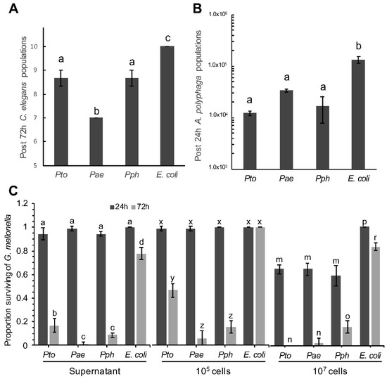 Temporal effect of Pseudomonas syringae strains on population sizes of Caenorhabditis elegans and Acanthamoeba polyphaga, and mortality of Galleria mellonella. (A) With initial populations of 10 L4 stage C. elegans, data shows number of C. elegans alive after 72 h, when challenged with Pto, Pae, Pph and E. coli control. ANOVA detected statistically significant differences (p = 0.0002, df = 8); (B) With initial populations of 1.2 × 104 A. polyphaga cells, data shows numbers of A. polyphaga cells after 24 h when co-cultured in presence of Pto, Pae, Pph and E. coli control. ANOVA detected statistically significant differences (p = 0.0008, df = 8); (C) Quantitative analysis of G. mellonella mortality by P. syringae, survival rate represents the relative number. Treatment type (supernatant, 105 and 107 cells), was analyzed separately by 2-factor ANOVA. An interaction between time and P. syringae treatments resulted in multiple comparisons for all types of treatment (p < 0.0001, df = 16). For all panels, bars represent the mean of 3 replicates, error bars represent standard error of the mean. Comparison of means by Tukey-Kramer HSD are shown as letters above bars, where different letters indicate statistically significant differences (p < 0.05).