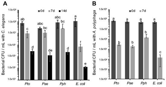 It is a reasonable hypothesis to propose that the negative impact of the P. syringae strains on C. elegans relates to strategies that have evolved to survive predation in the environment. Limiting toxicity to the host but at the same time surviving predation can be an important step for bacterial dispersion in the environment and colonization of new hosts [34]. Therefore, we decided to evaluate if the bacterial cells themselves were able to directly resist predation. To test strain survival following predatory challenge with C. elegans, 10 μL of 1 × 108 cfu mL−1 Pae, Pto, Pph and E. coli OP50 were co-incubated on an NGM agar plate together with 10 L4 stage C. elegans adults. Sets of plates were incubated at 23 °C for 7 and 14 days after which time the bacteria were recovered and the survivors enumerated. Significant differences in survival of the P. syringae strains compared to E. coli OP50 were observed after 7 and 14 days (Figure 2A). These results clearly indicate that nematode predation does reduce all the bacterial populations tested, but also that all three P. syringae strains tested were capable of resisting C. elegans predation to a greater degree than E. coli OP50. Furthermore, in experiments designed to assess the impact of A. polyphaga grazing, we again observed that while the amoebae were able to reduce numbers of all bacterial strains tested, the E. coli OP50 control exhibited a larger reduction in population size compared to the P. syringae strains (Figure 2B). Taken together, these results are consistent with the hypothesis that P. syringae has evolved anti-predation mechanisms for nematodes and amoeba, and also secretes one or more virulence factors toxic to an insect.