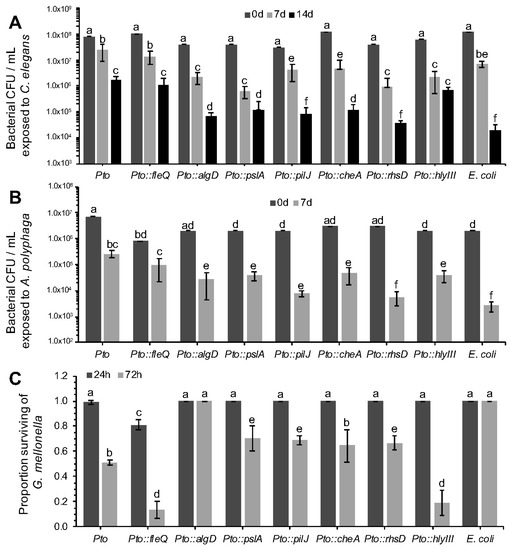 Characterization of Pto mutant survival after predation by Caenorhabditis elegans and Acanthamoeba polyphaga and killing of Galleria mellonella. See Table 3 for mutant descriptions. (A) Strains were assessed for survival against C. elegans predation. Bacterial populations were assessed after 0, 7 and 14 days of co-incubation with 10 L4 stage C. elegans. 2-factor ANOVAs detected statistically significant differences (p < 0.0001, df = 18); (B) Strains were assessed for survival when challenged with A. polyphaga. Bacterial populations were assessed after 0 and 7 days of co-incubation with 3 × 105 A. polyphaga cells. 2-factor ANOVAs detected statistically significant differences (p < 0.001 df = 12); (C) Quantitative analysis of G. mellonella killing by Pto mutants (105 cells). 2-factor ANOVAs detected statistically significant differences (p < 0.0001 df = 12). For all panels, bars represent the mean of 3 replicates and error bars indicate the standard deviation. Statistical differences were determined by contrasting each individual mutant to the Pto and E. coli controls, therefore different mutants cannot be compared between them but only to the controls themselves. Differences are shown as letters (p < 0.05).