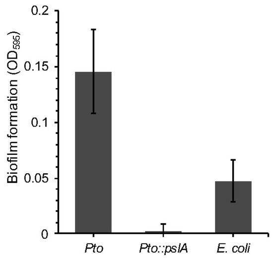 A Pseudomonas syringae pv. tomato strain DC3000 pslA mutant. Pto::pslA was assessed for the ability to form biofilms using crystal violet staining and measure of absorbance. ANOVA detected statistically significant differences (p = 0.0009 df = 9).