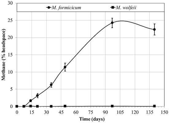Methane production did not occur for either methanogen species (M. formicicum or M. wolfeii) after 140 days’ incubation at 4 °C (data not shown). M. formicicum was able to produce methane at 22 °C, however, M. wolfeii was not capable of any methane production after 140 days at 22 °C (Figure 1).
