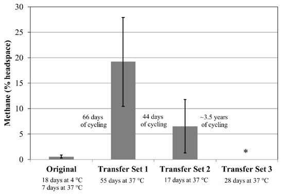 For M. wolfeii, three cultures produced an average of ~28% methane following the initial incubation period of 18 days at 4 °C followed by 7 days at 55 °C. In Transfer Set 1 for M. wolfeii, the three cultures failed to produce methane following inoculation from the Original Set following 55 days at 37 °C. After an additional 14 days at 55 °C, methane production resumed ranging between 4% and 19% for the three replicates, resulting in the large error bar seen in Figure 5. In Transfer Set 2, of the five cultures for M. wolfeii, two produced 22–25% methane after the initial incubation period (17 days at 55 °C), while the other three produced 6–11% methane, resulting in a large error bar for this set as shown in Figure 5.