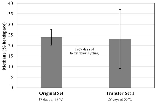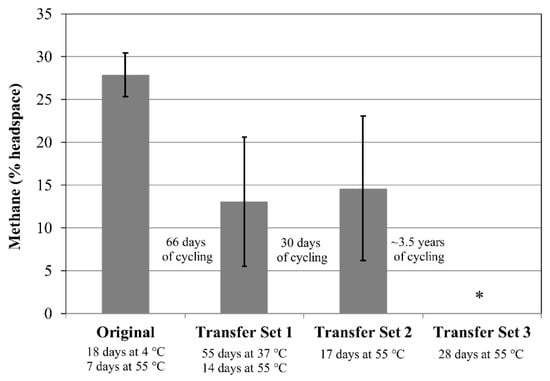 There were n = 4 tubes each for the Original Set, Transfer Set 1, and Transfer Set 2 for cultures of M. formicicum. For M. formicicum, methane production was nearly negligible (<1% headspace) for the four tubes within the Original Set after the initial incubation period of 18 days at 4 °C followed by 7 days at 37 °C (Figure 4). In Transfer Set 1, after 55 days’ incubation at 37 °C, three cultures measured 20–26% methane while one measured ~6% methane, resulting in the large error bar for the data shown for Transfer Set 1 (Figure 4). In Transfer Set 2, the four cultures produced varied amounts of methane ranging between 2% and 13% (Figure 4).