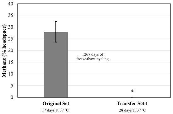 Methane production by Methanobacterium formicicum following an initial incubation period for each of two sets. Original Set test tubes contained 5 mL MSF medium. Transfer Set 1 test tubes contained 10 mL MSF medium. Transfer Set 1 tubes (n = 5) were inoculated from the corresponding replicate in the Original Set (n = 5) following 1284 days of freeze/thaw cycles (Table 5). The asterisk indicates that no methane was detected. Error bars indicate ± one standard deviation.