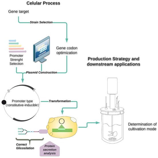Variations in cultivation strategies among the different yeasts will include oxygen requirement and co-product formation according to each yeast type of metabolism. For example, for being a fermentative yeast, optimization conditions of recombinant proteins in S. cerevisiae involves the ability to use different sugars and the relation between pH and percentage of dissolved oxygen (DO), while in K. phaffii oxygen is always present and may be used as a criterion for process optimization []. Moreover, pH, osmolarity, and temperature have previously been shown to influence recombinant protein production [,]. For example reduction of cultivation, temperature resulted in a 3-fold increase in the specific productivity of two different secreted Fab antibody fragments in glucose-based bioreactor cultivations [].