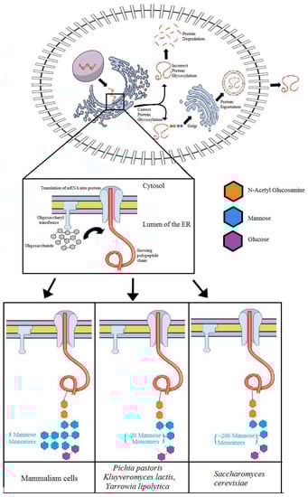 Yeasts have a conserved glycosylation system in which a 14-sugar oligosaccharide is transferred to the nascent proteins in the membrane of endoplasmic reticulum (ER) by the action of enzymes named oligosaccharyltransferases (OST) (Figure 2). The oligosaccharide is attached to an asparagine residue of the peptide and serves as a signal to the yeast as to whether or not the protein can exit the ER []. Another transferase, called UDP-glucose: glycoprotein glucosyltransferase (UGGT), is also involved in the glycosylation process and transfers a glucose monomer as a signal in case the protein is not ready to exit the ER [].