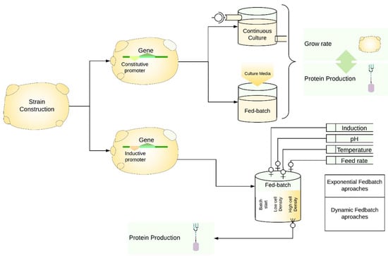 When the recombinant gene is cloned under the regulation of an inducible promoter, fed-batch strategies are preferentially used. In K. lactis fed-batch strategy achieved the highest protein titers on an industrial scale []. Fed batches for optimization of recombinant protein production are performed in a two-stage process where high cell density is desired prior to induction of heterologous gene transcription (Figure 2) [,,].