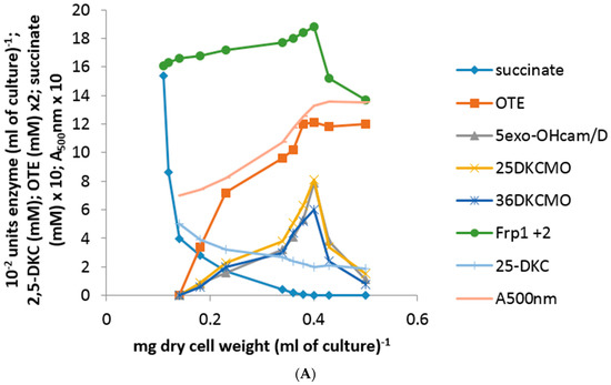 Plotting the total concentration of an enzyme (units enzyme [mL of culture−1]) against the culture density (mg dry cell weight [mL of culture−1]) generates a so-called differential plot which gives a measure of the rate of synthesis of an enzyme in relation to total cell synthesis [10,11,12]: the slope of such a plot, which corresponds to the specific activity of the enzyme, was termed the differential rate of synthesis by Jacob and Monod [11] and gives a visual representation of the induction rate of the enzyme [19]. Very similar patterns of progressively accelerating differential rates of synthesis of cytP450MO, 5-exo-HOcamDH (which is equally active with the corresponding 3-exo enantiomer [9,20]) and 2,5-DKCMO were obtained when the activities of these enzymes were measured at every 15 min interval throughout the 135 min following 5 mM (rac)-camphor addition to a culture (Figure 2A,B). Significantly, the differential rate of synthesis of 3,6-DKCMO was noticeably slower, which correlated with the consistently lower titre for this enzyme compared to the enantio-complementary 2,5-DKCMO recorded in extensive prior studies with (rac)-camphor-grown P. putida NCIMB 10007 [6,21,22].