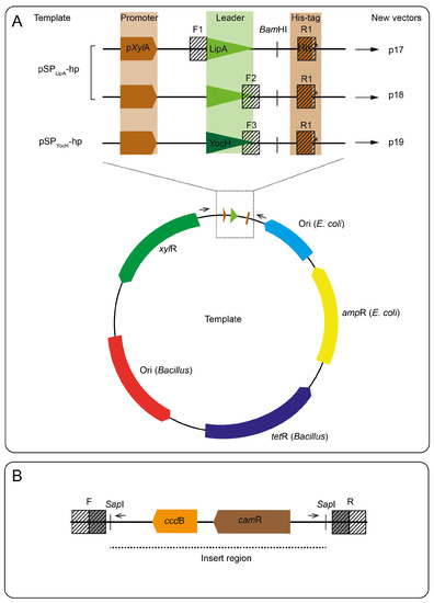 To facilitate screening of industrially relevant enzymes, such as subtilisins, efficient systems for high-throughput cloning and expression is essential. Here, we have developed three vectors for heterologous expression in Bacillus [20], named p17, p18, and p19, by adapting existing Bacillus-compatible plasmids to the FX-cloning principle (Figure 1). The ccdB-camR cassette was inserted to the pSPLipA-hp and pSPYocH-hp plasmids by linear amplification using a PCR product containing the cassette sequence as a megaprimer [28]. To confirm product formation before continuing with transformation, the PCR reaction itself was screened using primers flanking the insertion site. In these cases, the screening process identified a mix of both templates and products. During DpnI-digestions, the templates were removed, and positive clones selected. The three vectors allow intracellular as well as secreted expression. The p17 vector does not harbor a leader sequence, thus allowing exploitation of the putative native leader sequence from the enzyme of interest. The p18 and p19 vectors harbor known LipA and YocH leader sequences, respectively, which are known to facilitate export in Bacillus [34].