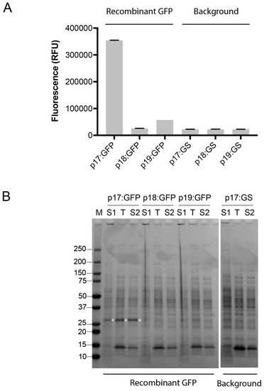 Recombinant expression of green fluorescent protein (GFP) in B. subtilis WB800N. (A) GFP expression from the p17 to p19 vectors was assessed by fluorescence measurements taken from the expression cultures. Fluorescence was compared to background controls (in which a GSGSGS-linker (GS) is replacing GFP in the vectors). Data is shown from one representative experiment, and error bars represent deviation in two technical replicates; (B) Sodium dodecyl sulfate polyacrylamide gel electrophoresis (SDS-PAGE) analysis of fractions from expression of GFP from the p17 to p19 vectors. S1, supernatant fraction; T, total protein in the cellular fraction; S2, soluble fraction of protein in cells. M, Precision Plus protein standard (Bio-Rad Laboratories).
