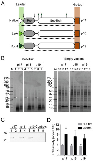The system was initially validated with expression of the GFP from the p17 vector (Figure 2). Expression trials with p18 and p19 vectors were not giving traceable amounts of GFP (Figure 2), which is likely explained by the fact that GFP is not directed for export using the Sec pathway [42]. To validate Sec-dependent export of proteins, subtilisin from B. licheniformis DSM13 was used and shown to be successfully expressed in all vectors (Figure 3B). This study confirms that these vectors can be used for secreted expression in B. subtilis. As such, the vectors could be explored for the replacement of native leader sequences with known sequences, particularly useful when the native enzyme sequence is divergent and may escape recognition by the Bacillus secretion systems.