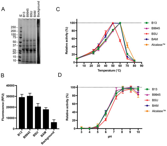 Four different subtilisin proteins expressed from FX-compatible Bacillus vectors. (A) A representative SDS-PAGE showing the supernatant fraction of the B. subtilis WB800N host after recombinant expression of native subtilisins from B. licheniformis DSM13 (B13), B. paralicheniformis ATCC 9945A (B9945), B. subtilis subsp. subtilis str. 168 (BSU) and B. amyloliquefaciens (BAM). Asterisks indicate recombinant enzymes (matured subtilisins expected mass is 28 kDa). Background represents expression of the empty vector; (B) Supernatants in A were screened for proteolytic activity against BODIPY-conjugated casein. Error bars show deviation in three biological replicates; (C) Temperature activity profiles of recombinant subtilisins (B13, green; B9945, magenta; BSU, red; BAM, blue) screened for proteolytic activity against the chromogenic succinyl-AAPA peptide, and compared to commercial Alcalase™ 2.4L (orange). Error bars show deviation in three biological replicates; (D) pH activity profiles of recombinant subtilisins screened against the peptide in C. Error bars show deviation in three biological replicates.