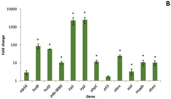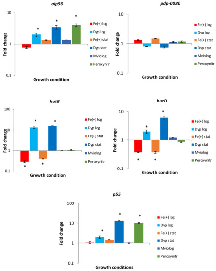 Relative transcription of Phdp genes aip56, pdp-0080, hutB, hutD and p55 in Phdp cells grown under iron-replete or limiting conditions and exposed to superoxide and peroxynitrite radicals. Fe (+) log and Fe (+) stat: Phdp cells were grown in TSBs supplemented with FeCl3 (100 µM) until log or stationary phase, respectively. Dyp log and Dyp stat: Phdp cells were grown in TSBs containing 2,2′-dipyridyl (100 µM) until log or stationary phase, respectively. MViolog: Phdp cells were grown until log phase and then incubated for 6 h in the presence of methyl viologen (0.2 mM). Peroxynitr: Phdp cells were grown until log phase and then incubated for 2 h in the presence of peroxynitrite (1 mM). Quantitative polymerase chain reaction (RT-qPCR) data were normalized against 16S rRNA gene and fold change values calculated at each sampling time relative to non-treated cells (grown in TSBs) based on the 2−ΔΔCt method. Values represent the mean ± standard error of the mean (SEM) of three independent experiments. Significant differences (p < 0.05) compared to non-treated cells have been indicated with an asterisk (*).