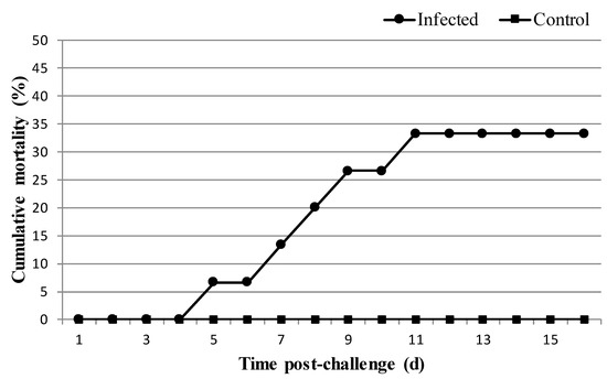 Phdp PCR detection and bacteriological analysis of fish were carried out before experimental infection with negative results. Mortality was observed only in the infected group and started 4 days after infection, with maximum (33% cumulative mortality) reaching 9 days post-infection (Figure 2). Afterwards, no mortality was recorded until the end of the experiment. Dead fish were analysed and the presence of Phdp was confirmed by PCR and bacteriological assays.