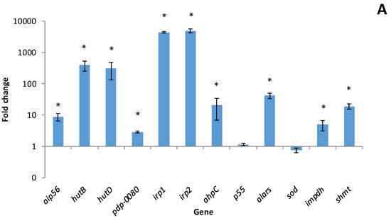 Reactive oxygen and nitrogen species can also be encountered by pathogens during host infection. Oxidative stress due to superoxide anions produced by methyl viologen did not modulate the transcription of assayed genes; however, aip56 and p55 genes were up-regulated by peroxynitrite, whilst no significant changes were observed in hutB, hutD and pdp-0080 (Figure 1).